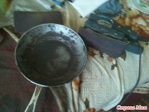 Ну правильно, как говорят нагар размягчился. Начала тереть ножом и губкой металлической. Муторно. Нашла выход называется))))))Вспомнила, что у мужа есть шлифовальная машинка)))))))Ну и попробовала ей)) ВЫ знаете, а это вещь!! 30 минут и сковорода стала не узнаваема)))))))