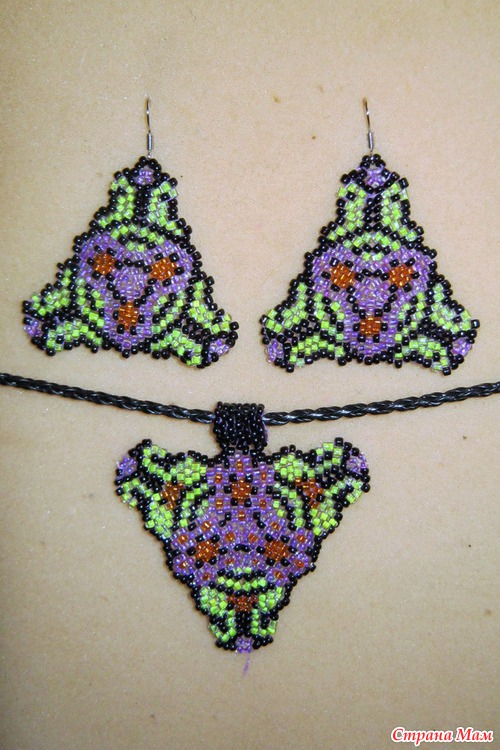 Ещё один треугольный комплект, на этот раз с цветочным мотивом. Изначально нужны были серьги под блузку. Нашла схему, сплела - великовато для сережек вышло, как по мне. Пришлось переделывать схему, чтоб поменьше треугольник получился. По-моему, вышло неплохо. Большой треугольник оставила как кулон (хотя к той блузке, для которой серьги делала, кулон не нужен, не смотрится, теряется.)