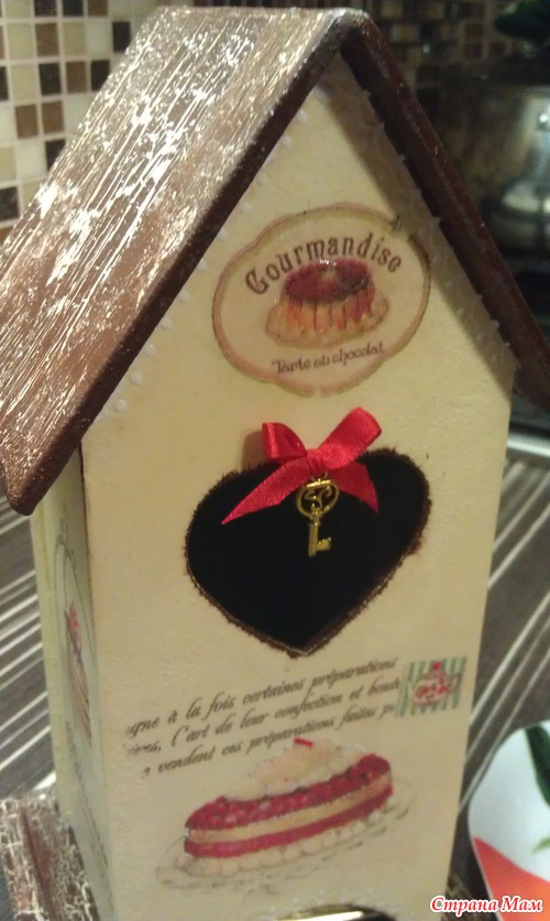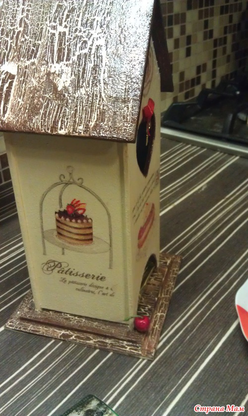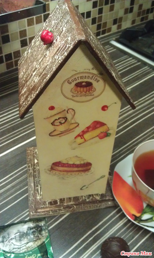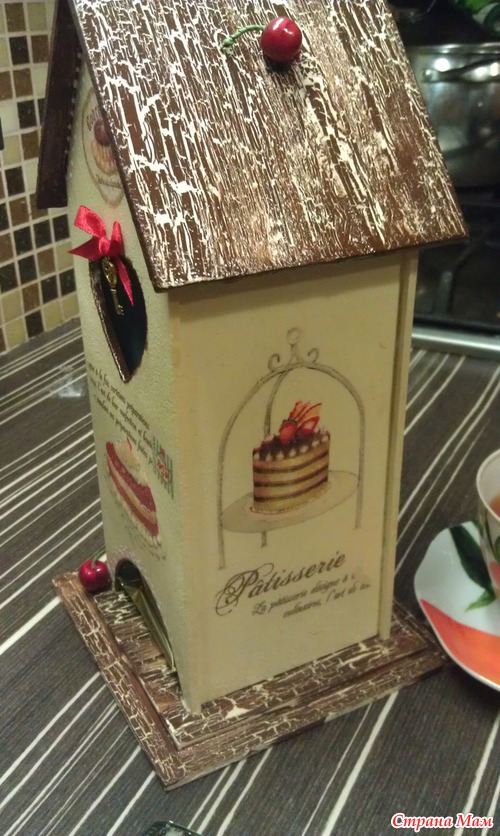 Чайный домик собрала, склеила, зашпаклевала, так что не было стыков видно при сборке.. нанесла грунт, фон сделала цвета слоновой кости, приклеила салфетку, на крыше и на основание домика сделала кракле одношаговое, приклеила бантик и вишенку..
