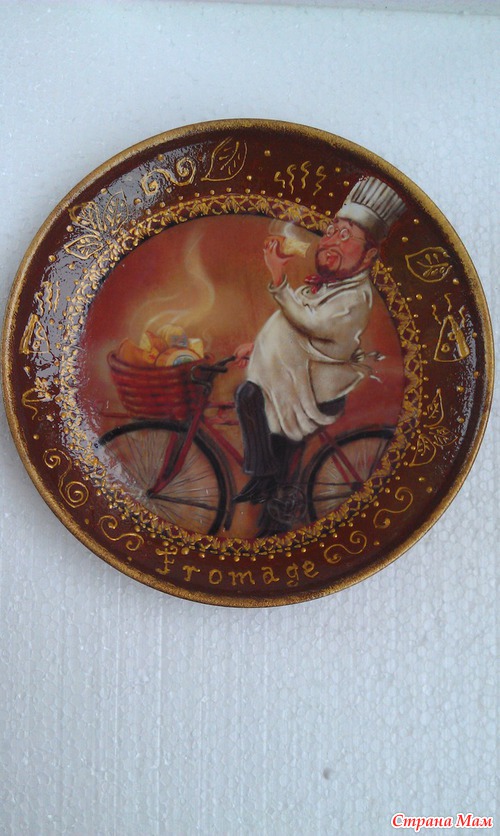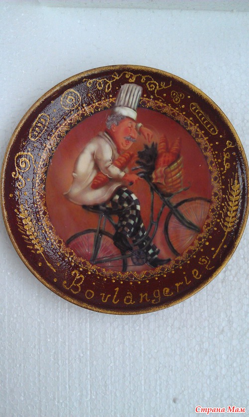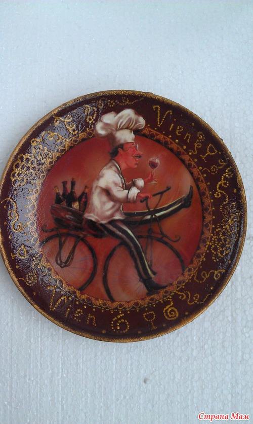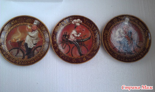 Тарелки были куплены в икее, загрунтовала, распечатку покрыла лаком, замочила, истончила и аккуратно приклеила на тарелку, нанесла фон по краям, контуром нарисовала небольшие рисунки вот принимайте товар...