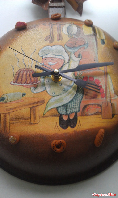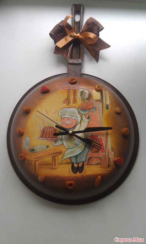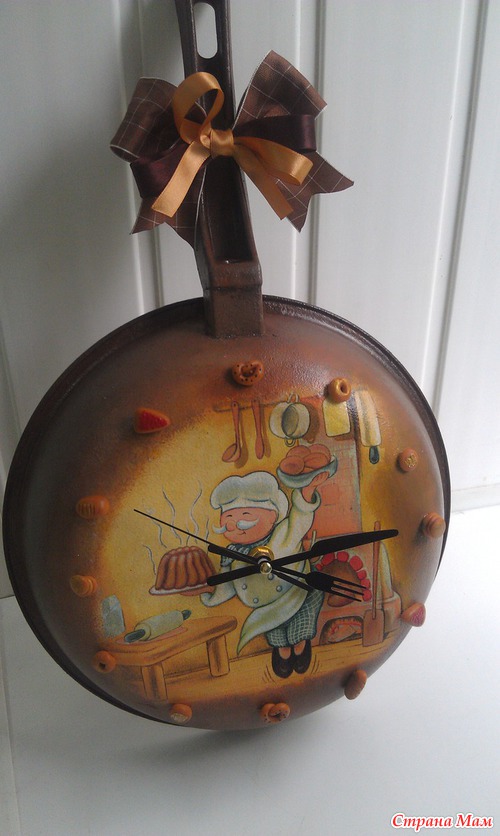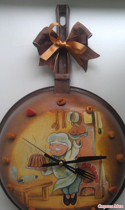 Валялись у меня парочка сковородок стареньких, решила из них сделать часики. Попрасила мужа он мне отверстие просверлил, сковородочку замочила от грязи отмыла.. загрунтовала, приклеила салфетку, по краям фон сделала, покрыла лаком.. А вместо цифр слепила из холодного фарфора крендельки.. вот что вышло