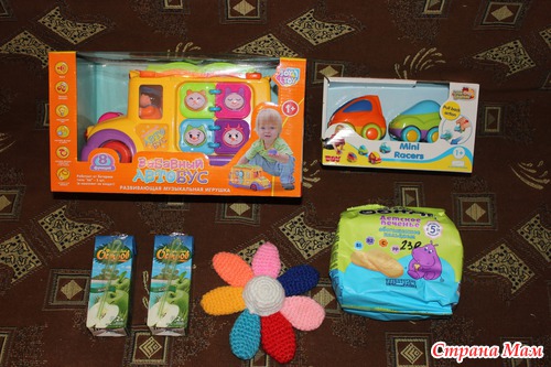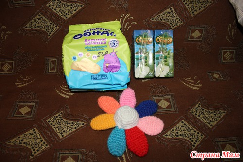 И сладкие печеньки и сок Дениске на десерт! А так же Цветик-семицветик который как я подозреваю сделала Усладушка лично!!! Отличная развивающая игрушка для Дениса чтобы выучить цвета!