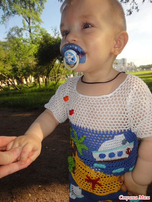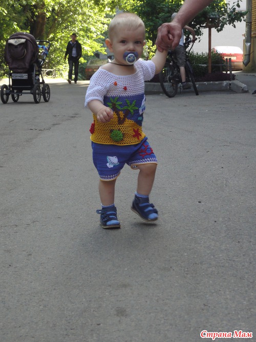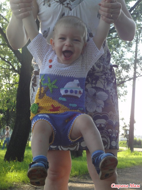 и вот на жаркие денечки связала сынуле такой костюм. Ниточки Сосо, крючок 2 и 2,5. Вязала вкруговую и обратно-поворотными рядами, практически без швов(только на плечиках). Конечно еще будет головной убор(наверно кепочка). А теперь много фото и в конце как всегда фото с сынулей)))