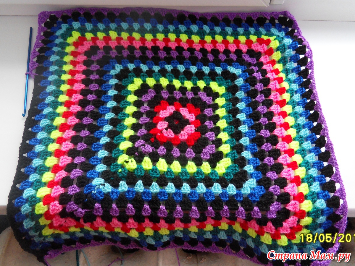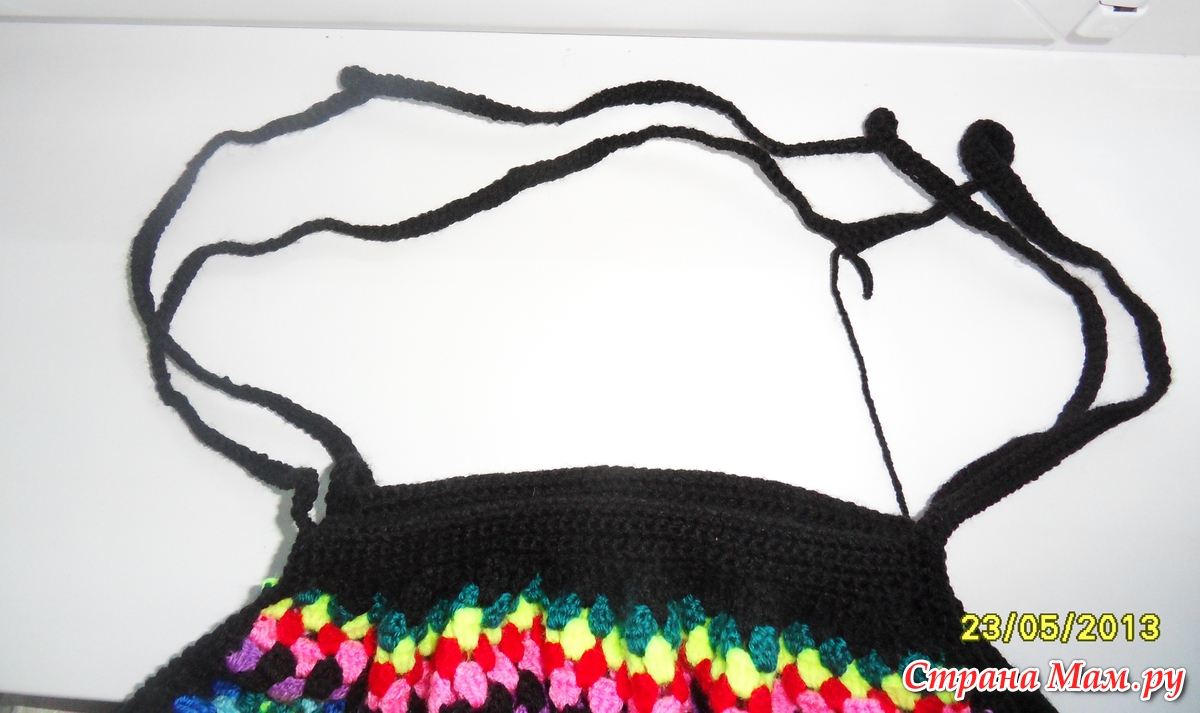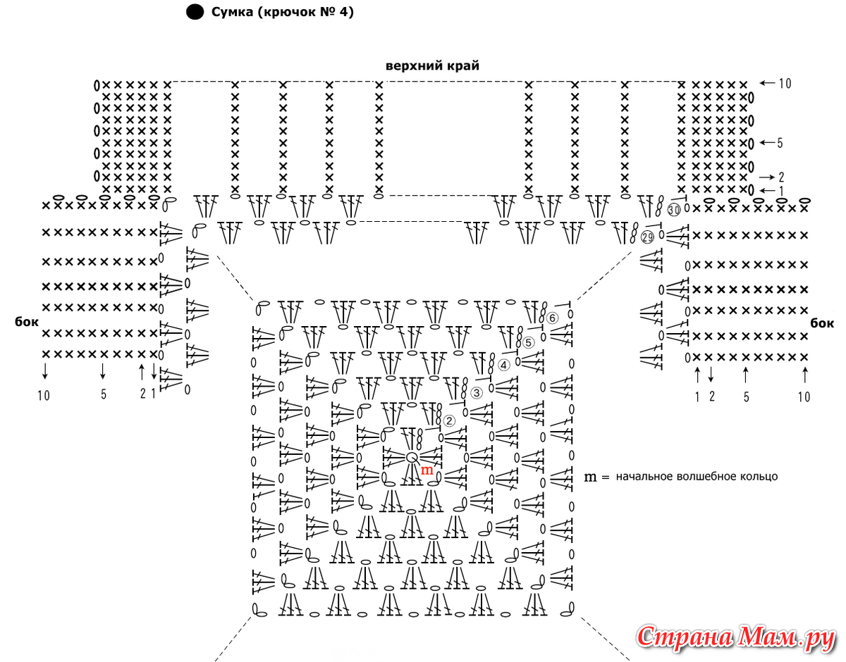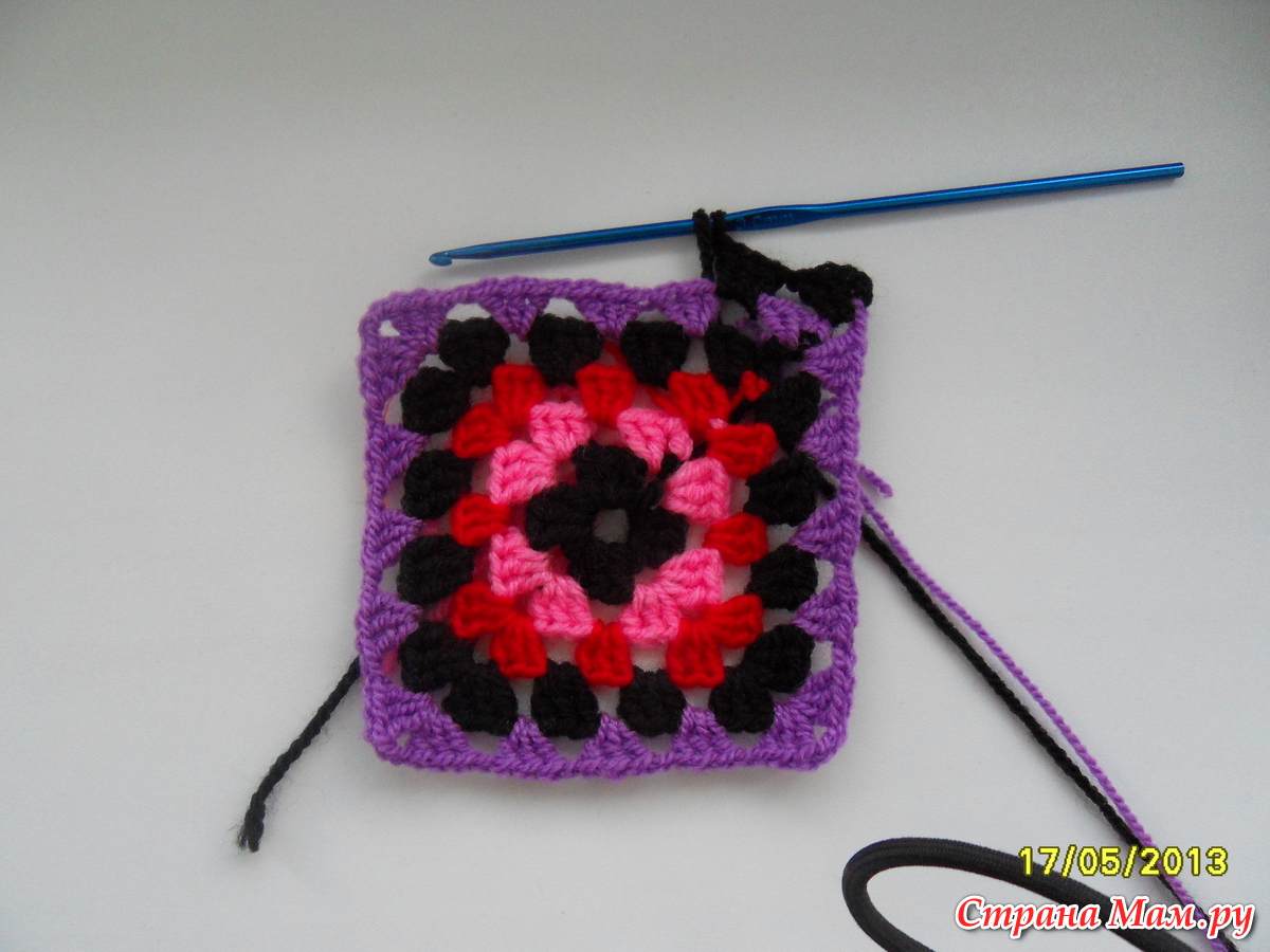 Полотно сумки: Выполнить начальное волшебное кольцо и 3 в. п. для подъема. Вязать по схеме квадрат из 30 рядов, меняя цвет в любом интересном порядке