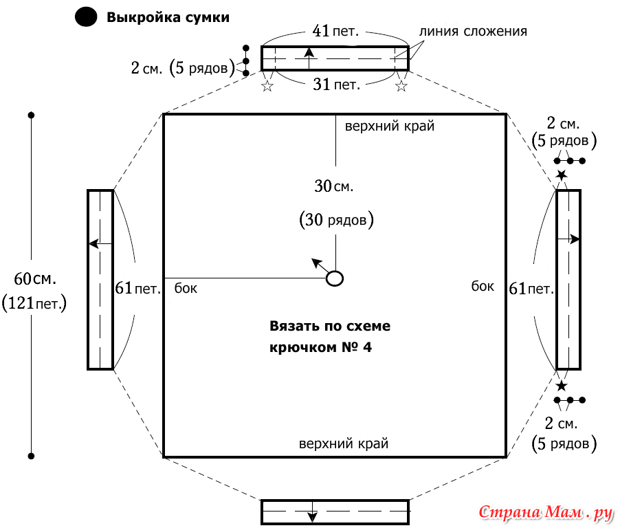 Бока (2): Вязать 61 СБН длиной в 10 рядов вдоль каждой из двух боковых сторон, затем сложить пополам внутрь сумки. Сшить петли последнего и первого ряда незаметными стежками с изнаночной стороны сумки.