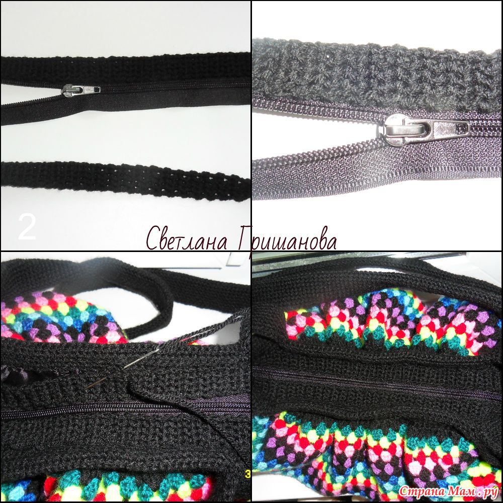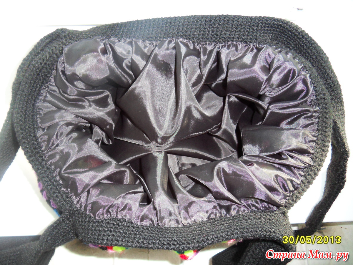 затем сложить вокруг ручек сумочки. Сшить петли последнего и первого ряда незаметными стежками с изнаночной стороны сумки.