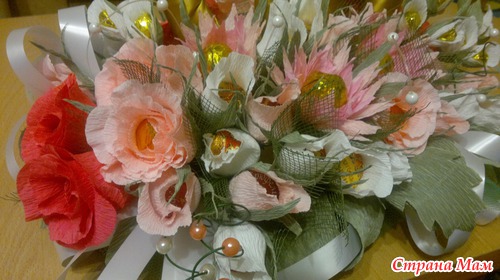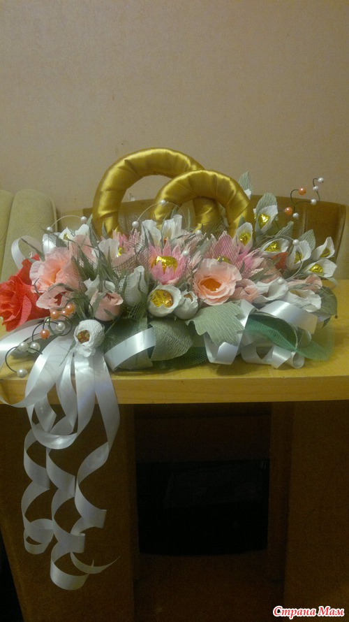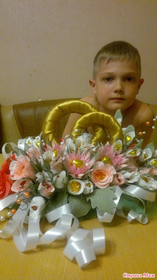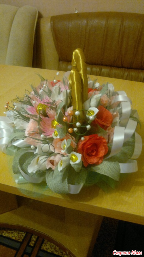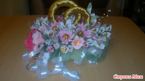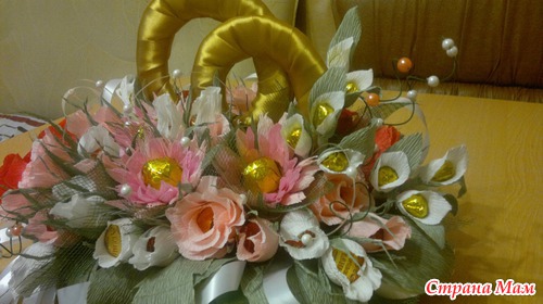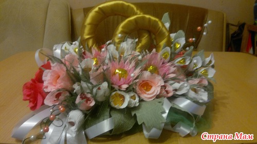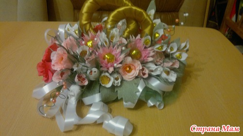 Вот такой подарок хочу сделать хорошему человеку на свадьбу. В композиции 15 белых бутонов роз,10 розовых бутонов, по 5 роз кораллового о розового цвета, 3 хризантемы и еще 4 цветка неизвестного названия. Кольца делала из картона. Обмотала их сначала синтепоном, а потом атласной лентой под золото. Читать полностью