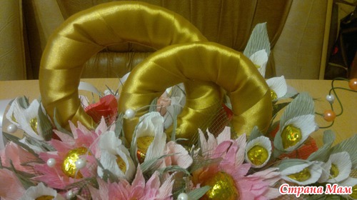 Вот такой подарок хочу сделать хорошему человеку на свадьбу. В композиции 15 белых бутонов роз,10 розовых бутонов, по 5 роз кораллового о розового цвета, 3 хризантемы и еще 4 цветка неизвестного названия. Кольца делала из картона. Обмотала их сначала синтепоном, а потом атласной лентой под золото.