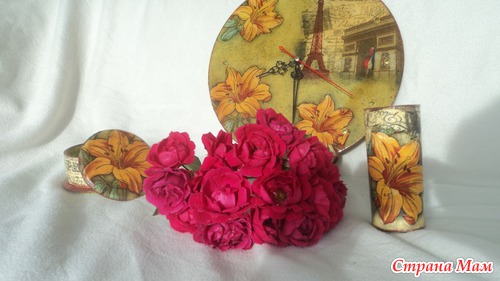 Вот сделала ей в дополнение к основному подарку такой наборчик: часы, шкатулочка и вазочка-пусть мальчишки цветы дарят. У нее в комнате фото обои Париж. Так что набор по цвету, по сюжету.