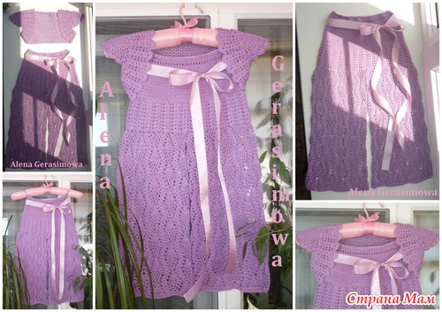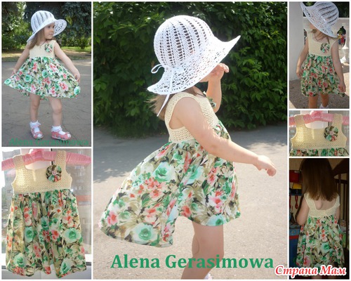 Сотворила для дочи комбинированный сарафанчик, кокетка связана галочками из ниточек Vega, а юбка из ткани, забыла тольк из какой, похожа на шифон только поплотней чуть!