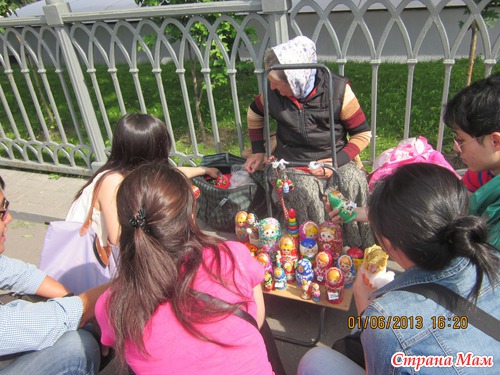 А вот я увидела, как иностранные гости окружили бабульку, которая торговала матрёшками. Они так увлеклись ими. Вообще сегодня было очень много иностранцев. Были и итальянцы