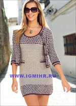 Вам потребуется: для жакета по 150 (200) 200 г коричневой и бежевой, 100 (150) 150 г светло-серой, для платья 250 (300) 350 г бежевой, 100 г коричневой и 150 (150) 200 г светло-серой пряжи Samea (72% хлопка, 20% вискозы, 8% льна, 105 м/50 г); прямые спицы № 4; круговые спицы и крючок № 3,5; 4 пуговицы.
