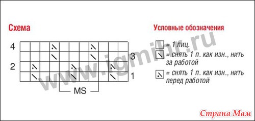 Узор из снятых петель, спицы № 4: число петель кратно 4 + 3 + 2 кром. Вязать по схеме, на которой приведены лиц. и изн. р. Начинать с 1 кром. и петель перед раппортом, повторять раппорт, заканчивать петлями после раппорта и 1 кром. Повторять с 1-го по 4-й р