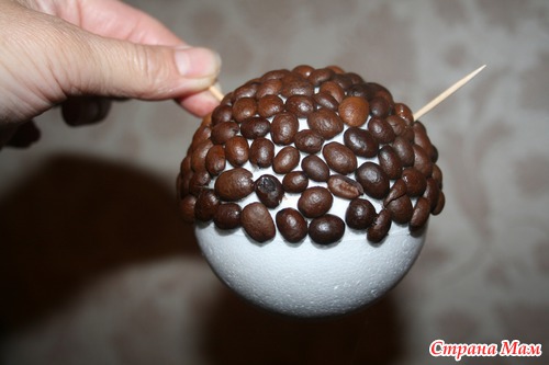 Далее когда пенопластовый шарик обклеен зёрнышками кофе в два слоя,