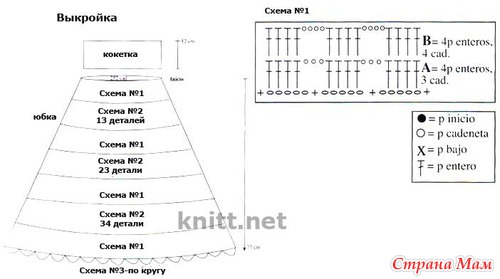 Вязание начинается с верхней части ( кокетка вывязывается в конце). Данное изделие связано из частей, чередование узоров 1 и 2. Отдельно вяжутся 3 полоски узором 2, для каждой полоски обозначено количество мотивов, так как полоски разной длины. Все соединения полосок выполнены 2 рядами(*1 столбик с накидом, 4 воздушные петли*)-см. фото модели.