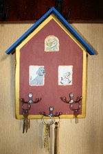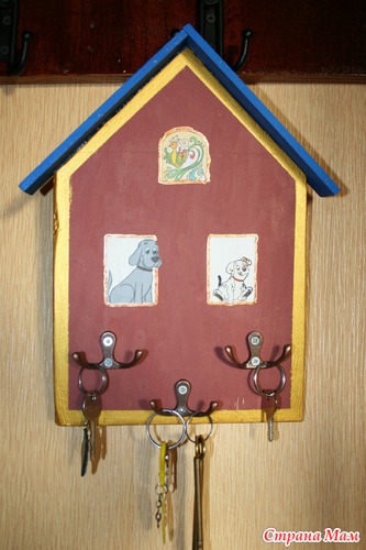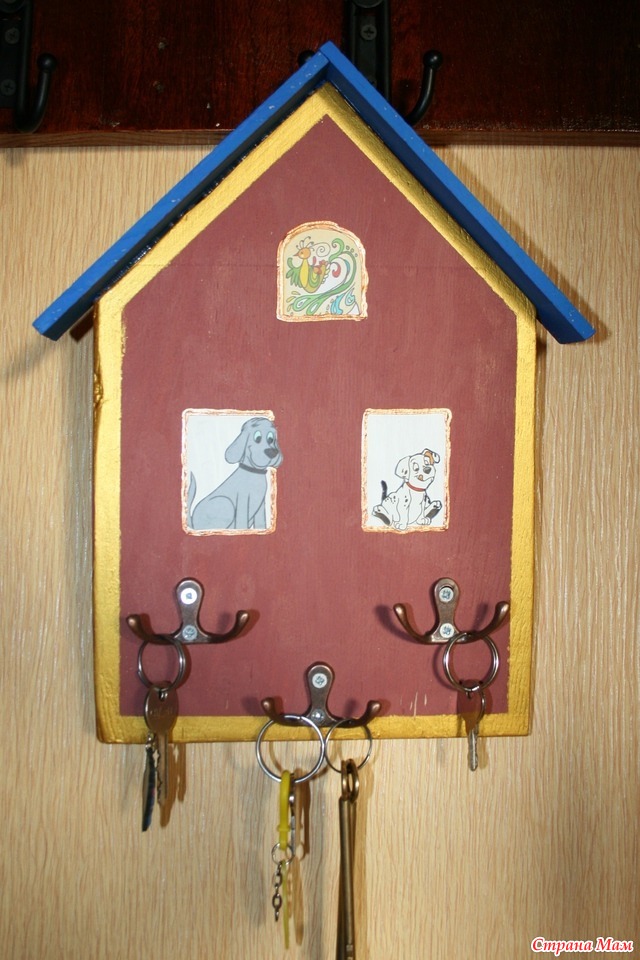 В школе объявили творческий конкурс. Ребенок 7 лет, все сам выпилил, просверлил, покрасил и прикрутил.Из фанеры 12мм электролобзиком выпилил основу домика, из остатков ламината ножовкой по металлу выпилил 2 куска крыши, просверлил дырки для шурупов махоньким сверлом. Покрасил акриловыми красками, приклеил крышу и картинки в окна. Крючки приворвачивал простой крестовой отверткой, шуруповерт его не слушался и шурупы по всей кухне летали.Понавешали ключей.