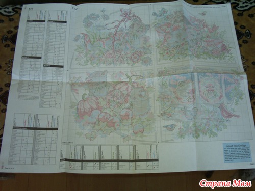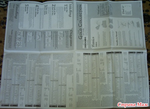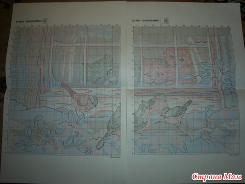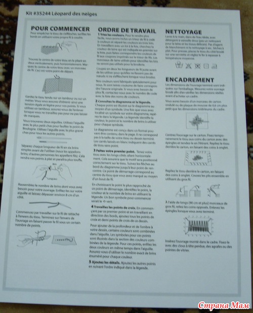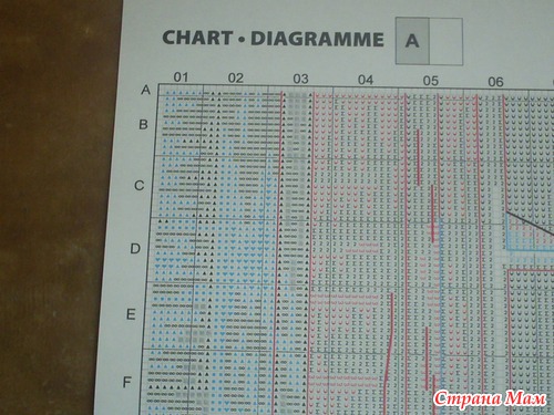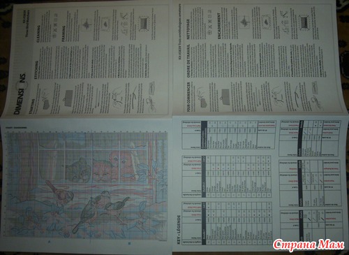 Схема китайской сборки на несколько страницах, размер символов остался таким же маленьким, на одном из листов в формате A4 дана полная схема вышивки и показано соединение листов. Кроме того, в схеме промаркированы клетки цифрами и буквами. Мне в наборах попались инструкции на Русском языке