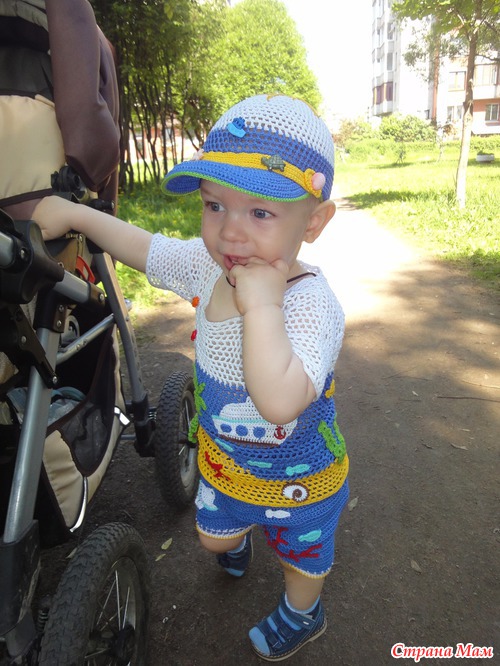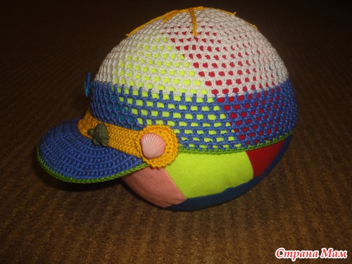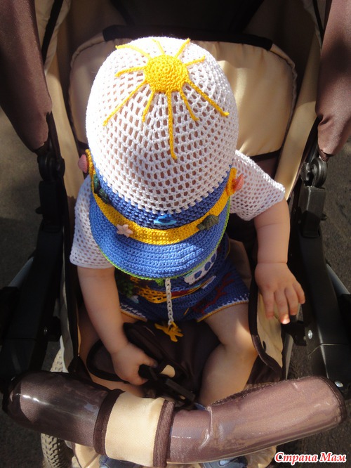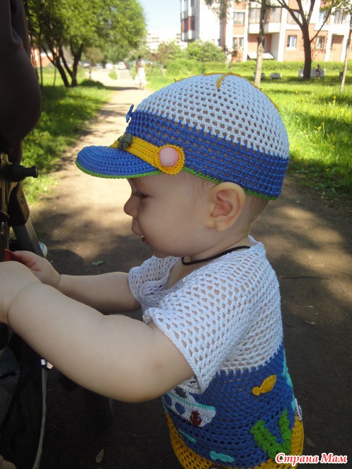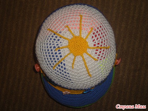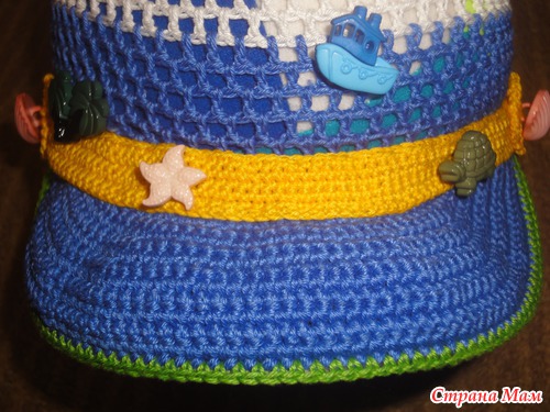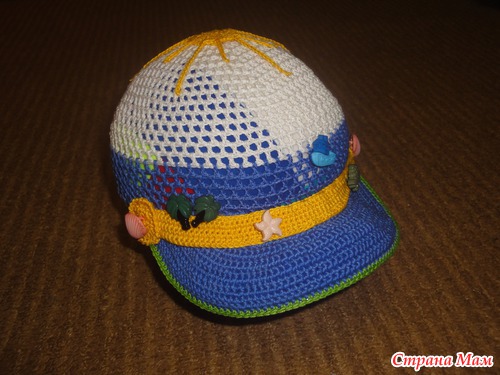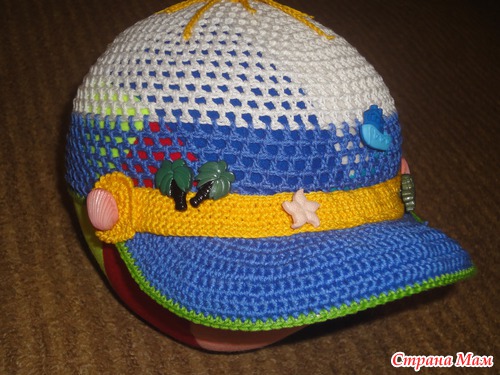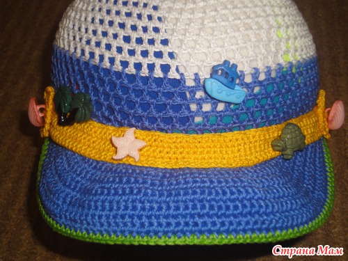 Связала легкую кепочку(продуваемую и с козырьком от солнышка). Ниточки Сосо, крючок 2, а для козырька 1,5 вязала сначала по спирали, далее замыкая ряды. Первый раз вязала кепочку и вставляла регилин(ох и намучалась-и ниточкой обматывала и клеила и кончики прижигала...)Решила не нагружать аппликациями, а декорировать пуговицами...