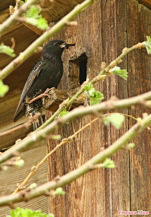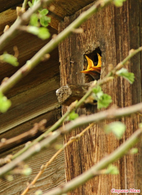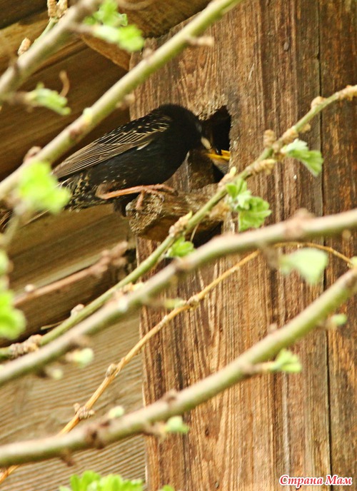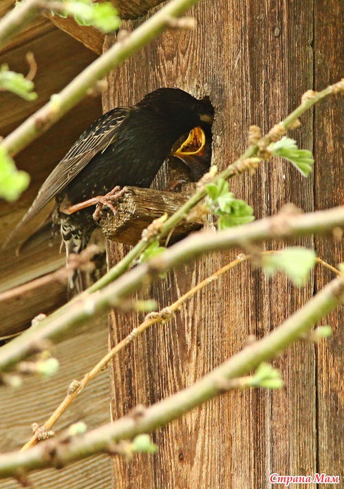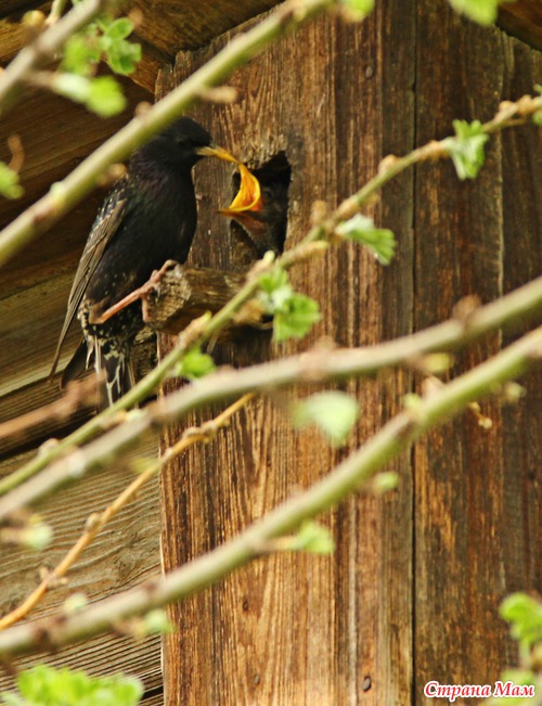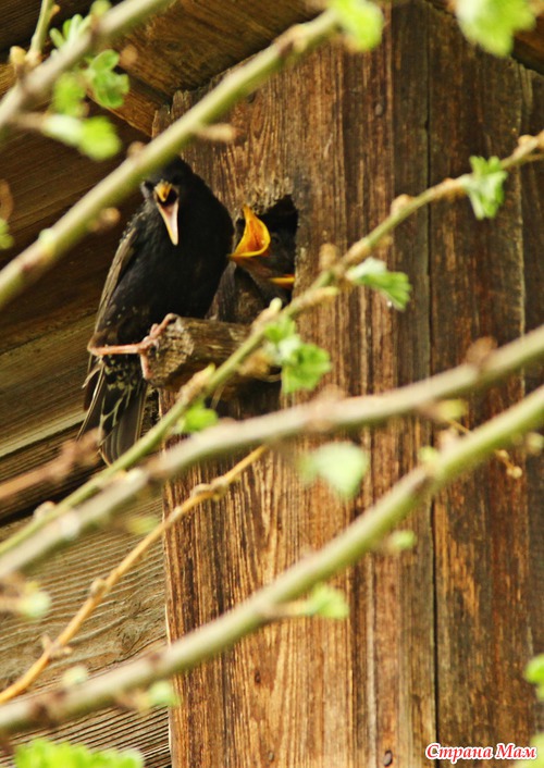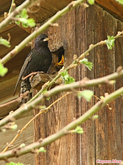 А днём увидели, что у бабушки на доме висит скворечник, в котором поселилась семья скворцов со скворчатами. Родители носят малышам еду. Покормят, улетят, а птенцы ещё какое-то время громко-громко кричат.