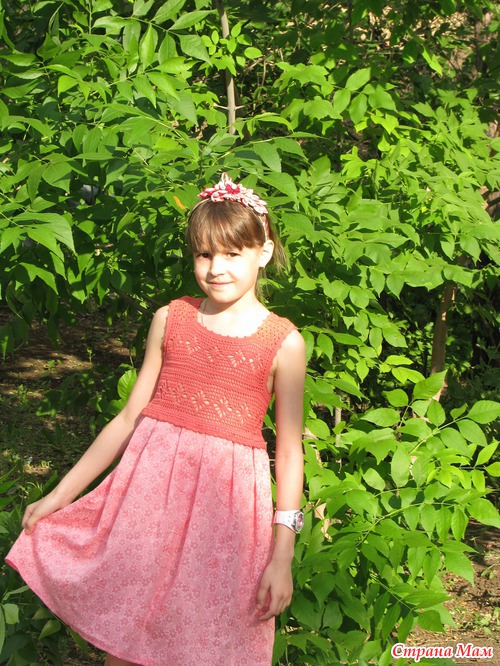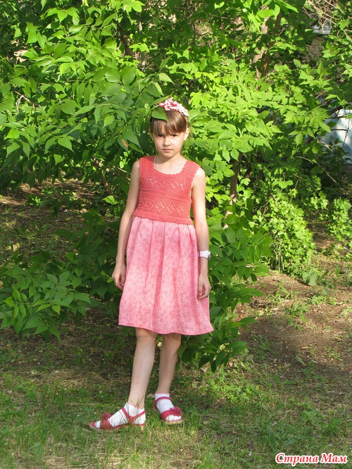 Наконец-то я доделала лифоманию для Юляши! Начинала в том году, но получилось очень велико... убрала в ящик... В этом году вспомнила, достала и решила доделать, ребенок едет в лагерь, надо ж там покрасоваться На лиф ушло 100 гр пряжи Камтекс, 100% хлопок мерсеризованный, 50гр/200м, крючок №2, №1,7 на обвязку пройм. Ткань батист. Немного не довольное лицо, пока шли до зелени, поднялся неприятный ветер... Но Юляша очень довольная!