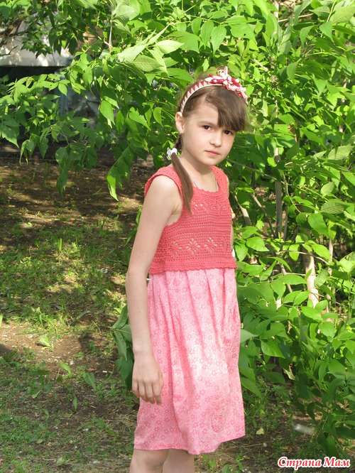 Наконец-то я доделала лифоманию для Юляши! Начинала в том году, но получилось очень велико... убрала в ящик... В этом году вспомнила, достала и решила доделать, ребенок едет в лагерь, надо ж там покрасоваться На лиф ушло 100 гр пряжи Камтекс, 100% хлопок мерсеризованный, 50гр/200м, крючок №2, №1,7 на обвязку пройм. Ткань батист. Немного не довольное лицо, пока шли до зелени, поднялся неприятный ветер... Но Юляша очень довольная!