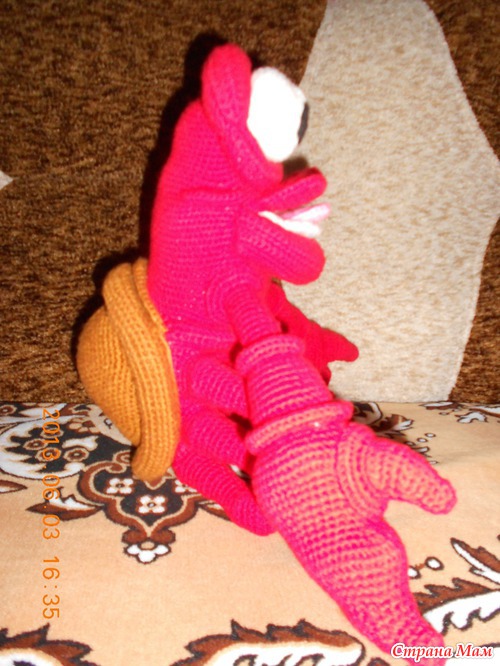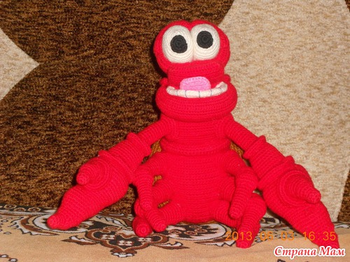 Подкинула мне одна из подруг подарочек - описание краба Себастьяна из мульта "Русалочка", выискала где-то на просторах интернета. У меня это была любовь с первого взгляда. Решила сразу: он будет мой во что бы то не стало. Вот тогда и начались мои мучения. Это первая игрушка, которую я вязала целый месяц с огромными перерывами. Несколько раз пыталась всё бросить, но снова начинала. В общем, от любви до ненависти один шаг, не врут люди. Вот вчера я всё-таки ЕГО довязала. Получилось вроде бы похоже. Краб большой - 35 см, и тяжёлый. Но главное, дочке очень нравится, это самое большое признание.