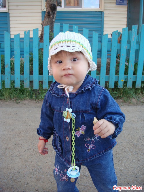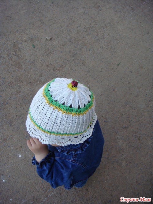 Связала ромашковую панамку. Пришлось делать завязки, т. к. постоянно снимает с головы. https://www.stranamam.ru/post/5605152/ Фото только такие, потому что доча постоянно бегает, трудно ее словить.