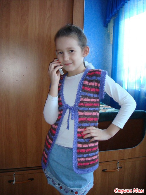 Связала старшенькой жилетку из остатков пряжи: хлопок. акрил. Украсила бусинами. Вязала без схемы и описания, полная импровизация.