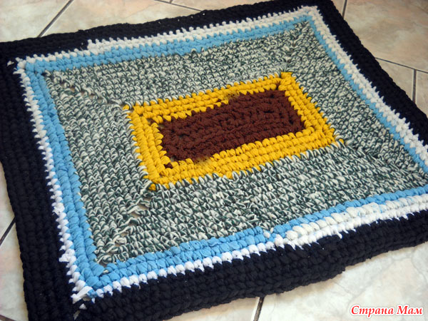 Связала коврик из футболок и пряжи. В ход пошли старые футболки, колготки, пряжа в несколько сложений. Коврик получился прочный и добротный. Вязала крючком № 5. Футболки нарезала по спирали.