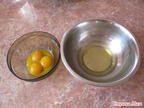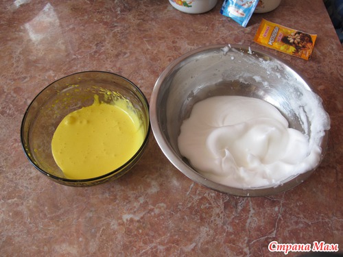 Взбить по отдельности желтки и белки (добавить к белкам соли на кончике ножа, чтобы легче взбивалось)