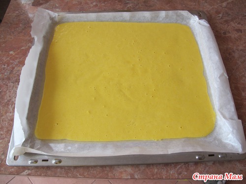 На деко постелить пергамент, смазать маслом и посыпать мукой. Вылить тесто и аккуратно его разровнять