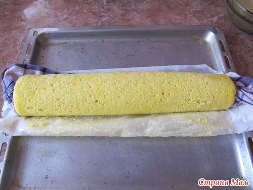 За этот момент корж стал уже не такой горячий, раскручиваем, вынимаем полотенце, и скручиваем опять, оставив скрученный до полного остывания, иначе крем потечет.