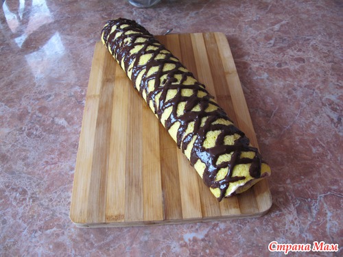 Свернуть рулет и украсить. У меня для украшения растопленный на водяной бане черный шоколад (чуть добавила водички, чтобы легче было наносить)