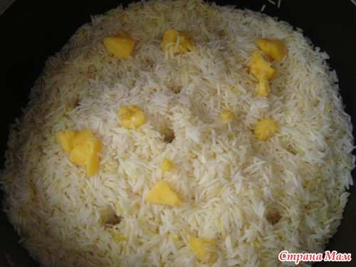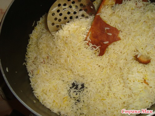 Сварим до полуготовности рис, откиним на дуршлак, и соберем в казан. Добавим шафранили куркуму. На них куски масло, и дырочки откроем чтоб пар выходил. А На крышку казана оденим либо спец шапку, либо обвернем полотенцем чтоб пар впитал.