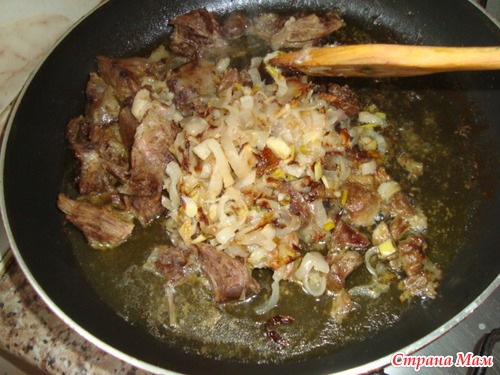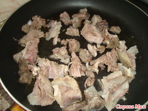 Вот, отварим мы говяжее мясо, затем начинаем в масле жарить,
