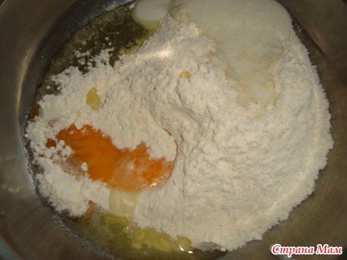 Сделаем Казмаг, Для этого мука яйцо. кефир пол ст. соль и немного масло сделаем тесто