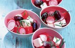 Понадобится: 500 г мякоти арбуза, 200 г сыра фета или несоленой брынзы, пучок мелкого редиса, 1/5 пучка мяты, 1/2 банки оливок, 4 ст. л. меда, 2 ст. л. оливкового масла, черный молотый перец.
