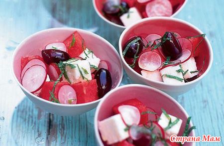 Всем известный греческий салат может зазвучать по-иному, уверена молодая хозяйка. Стоит только заменить томаты и перец на арбуз и редис с добавлением мяты. Сочная рубиновая мякоть в компании с ментоловой свежестью - что еще нужно в жаркий день?