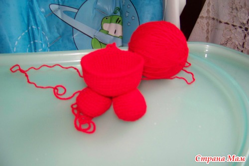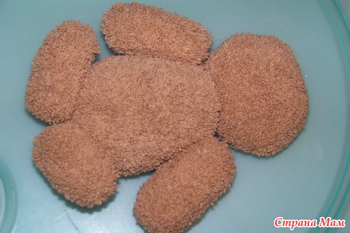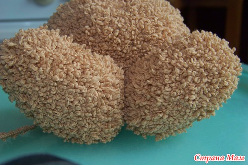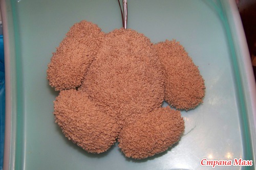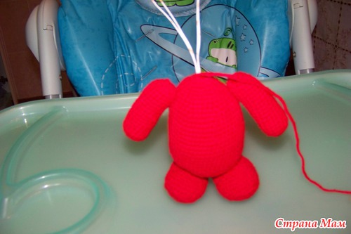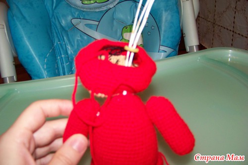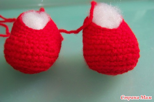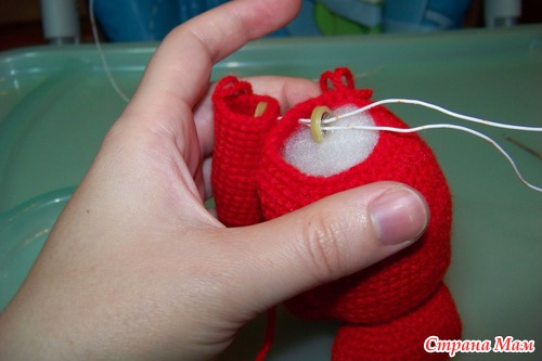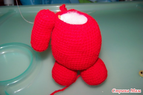 Набить ножки наполнителем. Ножки из крохи, как и все остальные детали я пришивала пряжей в тон. (у меня кажется хлопок Лотос) Можно шелковыми нитками.