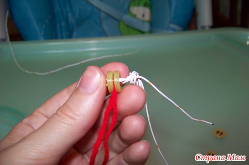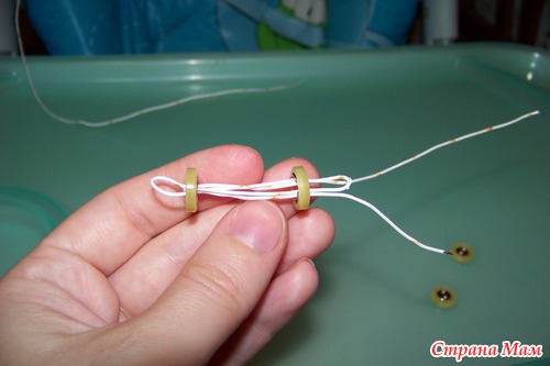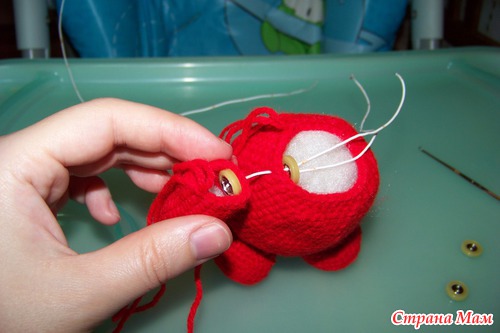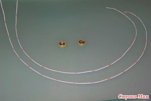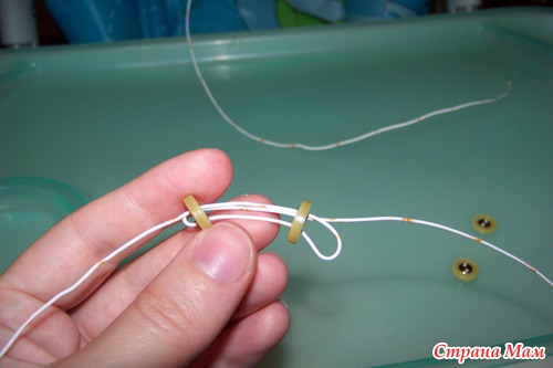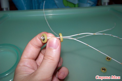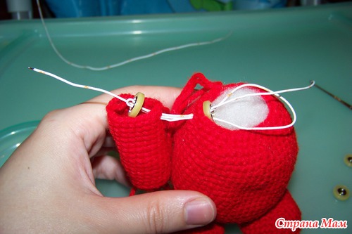 сверху торчит проволока. потом ее проденем в голову и уже после этого наденем пуговицу и закрепим.