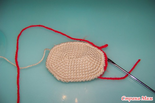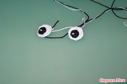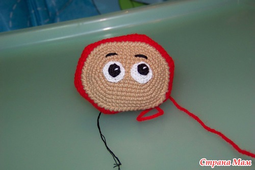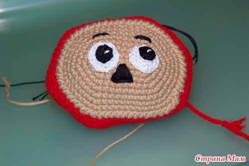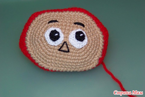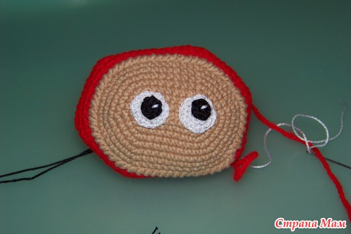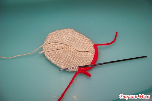 Пришиваем лицо. Сделать это нужно после 8р. потом это будет сделать сложнее. После продолжаем вязать.
