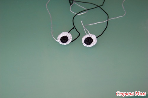 Теперь пришиваем глазки белыми нитками к лицу. Сначала прикладываем и определяемся с размещением глазок, можно зафиксировать.