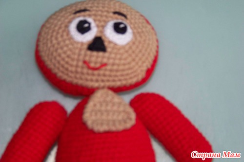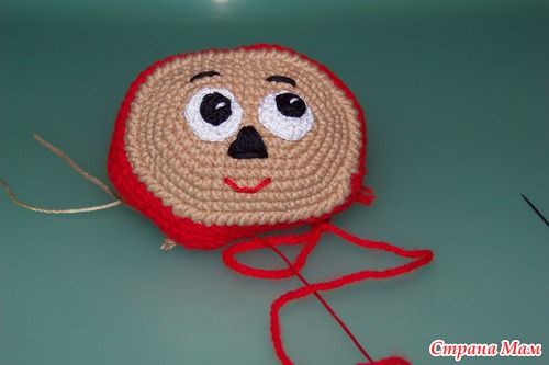 Обвязать рачьим шагом. Пришиваем глазки, вышиваем ротик, брови. Отложить лицо.