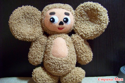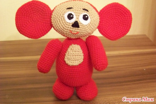 я решила глазки не вязанные сделать, а подвижные. мне так больше нравится, чебуран лежит, потому что глаза еще не приклеены, буду подбирать личико уже с готовыми ушами