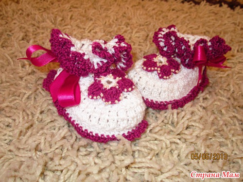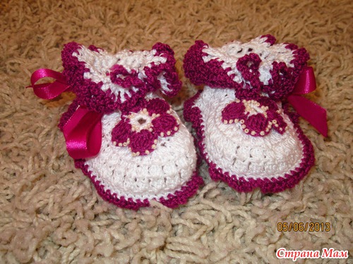 Пинетки вязала Перхоркой Успешной. Если честно- пряжа мне не понравилась, Она растягивается, форму не держит, после стирки выглядит не очень, но это конечно моё мнение, может кто-то и вяжет этой пряжей удачные вещицы, но я теперь если и буду ей вязать, то только какой-то узор, не более. Но дочурке всё таки пинетки связались