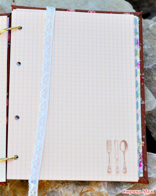 Домашняя, уютный блокнот для ваших рецептов! Внутри есть 4 вкладыша для подписи разделов! На форзаце есть кармашек для мелких вырезок. Закладка из хлопкового кружева. Обложка мягкая за счет внутреннего слоя флиса. Блокнот на кольцах очень удобен тем, что, разжав их, вы можете добавлять вырезки из газет или журналов, дополнительные страницы, удалять ненужные! Формат А5 (половина альбомного листа) Цена 750 рублей