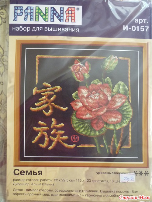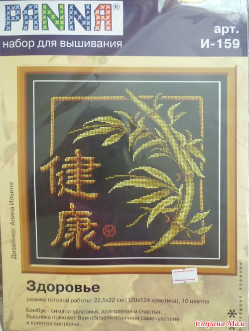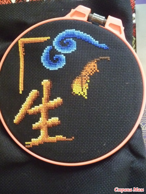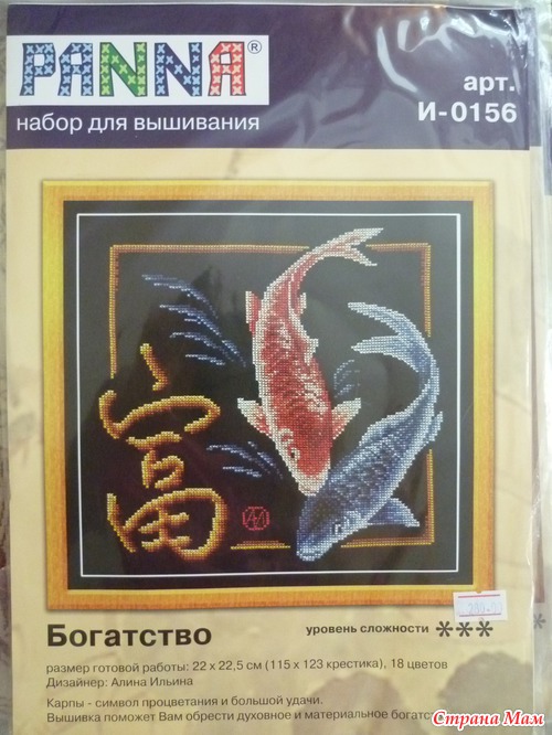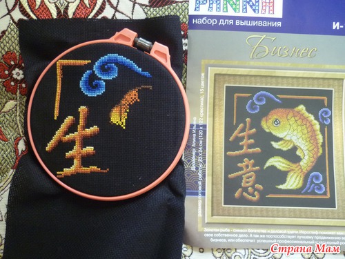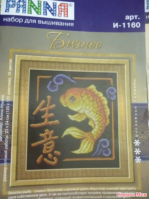 Во-первых, купила наборы с иероглифами, очень нужно развитие моего СП с детской одеждой, поэтому решила вышить вот такую золотую рыбку: