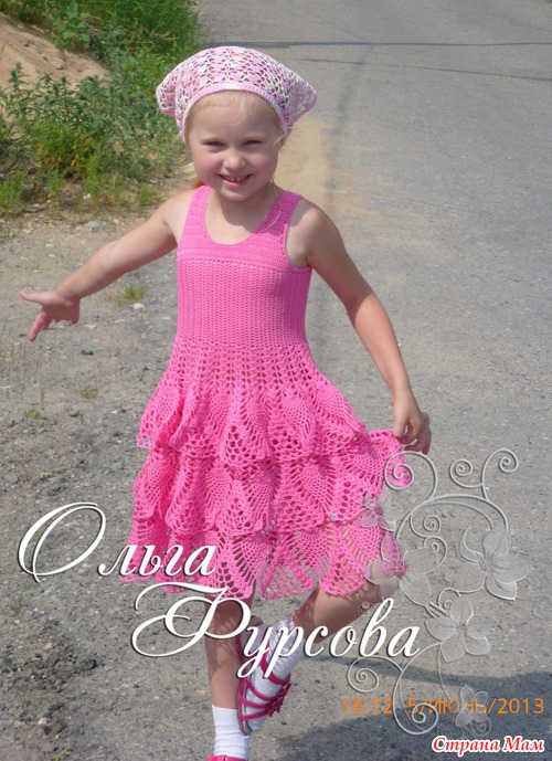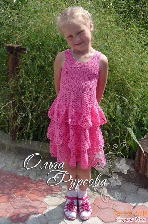 Все платья связаны для крестницы без примерок (сюрпризом ). Зеленое - вечерний вариант, ко дню рождения (сейчас уже покороче стало, за 6 месяце девочка подросла), а розовое вытянулось под тяжестью воланов (планировалось коротким сарафаном, даже количество воланов сократила, но... как говорится обстоятельства непреодолимой силы), а распускать не охота, да и обновку ребенку очень хотелось выгулять