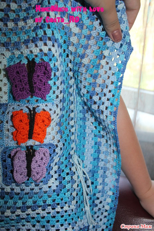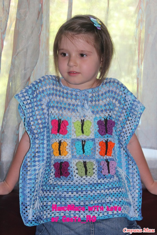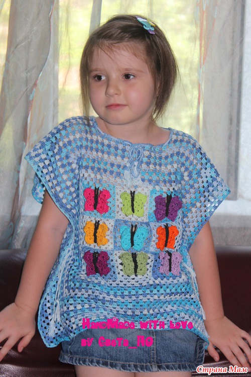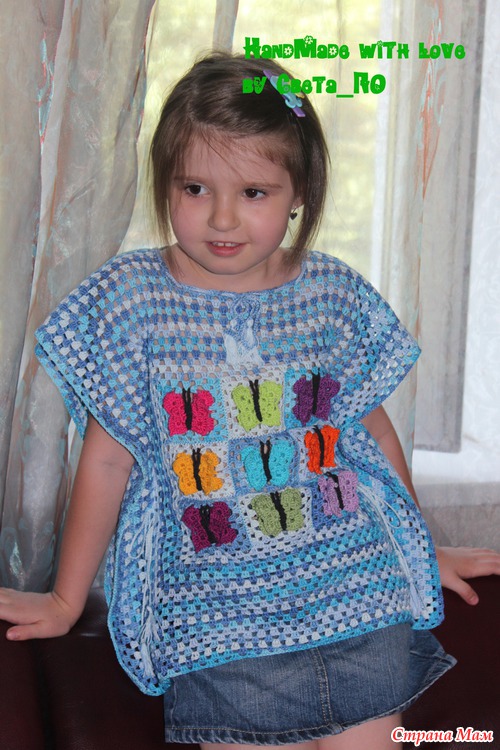 Правда, на вешалке, честно, смотрится какой-то тряпкой, - и я до последнего момента сомневалась в успехе "этого предприятия"... но когда моя Майка одела его с коротенькой джинсовой юбочкой - все сомнения прошли... Вещь очень практичная - я в боках не сшивала, а просто связала веревочку из ВП и ею "зашнуровала" - с ростом ребенка ее можно расширить... (в горловине тоже самое)... Про 3D-бабочки - вяжутся тоже "бабушкиным квадратом" - у меня в альбоме есть МК, если кого заинтересовало - сюда не выкладываю, т. к. много очень пошаговых фото...