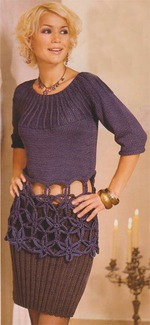 Вам потребуется: 600 (650) г пряжи цвета сливы и 400 г коричневой пряжи Roxy (60% полиамида, 40% шелка, 75 м/50 г); прямые спицы № 6 и № 7; круг, спицы № 7; крючок № 5 – 6; коричневые эластичные швейные нитки.